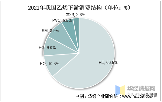 我國(guó)乙烯工業(yè)已逐步進(jìn)入成熟期,下游衍生物主要有PE、環(huán)氧乙烷(EO)、EG、SM、聚氯乙烯(PVC)等產(chǎn)品。五類產(chǎn)品共占乙烯總消費(fèi)量約97.2%。其中,最大消費(fèi)領(lǐng)域是PE,占總消費(fèi)量的63.5%。其次是EO和EG,分別占10.3%和9.0%。
