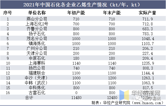 2021年中國(guó)石化各企業(yè)乙烯生產(chǎn)情況(kt/年,kt)