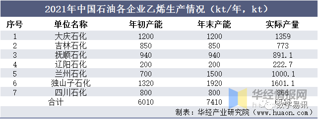 2021年中國(guó)石油各企業(yè)乙烯生產(chǎn)情況(kt/年,kt)