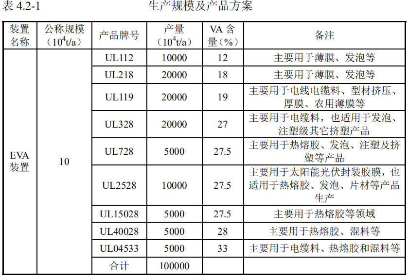 本項(xiàng)目EVA裝置設(shè)計(jì)規(guī)模10萬(wàn)噸/年,年操作時(shí)間8000小時(shí),操作彈性:60-110%。產(chǎn)品方案包括 UL112、UL218等9個(gè)牌號(hào)的 EVA 產(chǎn)品。產(chǎn)品方案見(jiàn)下表。