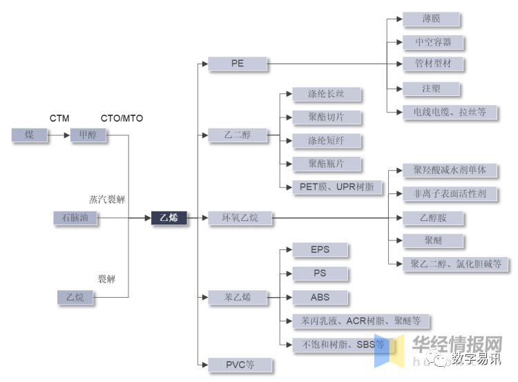 乙烯生產(chǎn)工藝流程可分為三類:煤制烯烴(CTO/MTO)、石腦油蒸汽裂解、乙烷裂解。乙烯下游產(chǎn)品包括聚乙烯(PE)、乙二醇、環(huán)氧乙烯、苯乙烯、聚氯乙烯(PVC)等,這些衍生物的主要下游產(chǎn)品有塑料、纖維、橡膠等合成材料以及表面活性劑、黏合劑、涂料等,最終應(yīng)用于包裝、農(nóng)業(yè)、建筑、電子電器、機械和汽車等行業(yè)。
