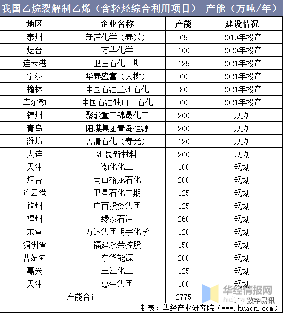 與傳統(tǒng)石腦油裂解路線相比,乙烷裂解具有工藝流程短、裝置投資少、乙烯收率高等優(yōu)勢。特別是在我國煉油產(chǎn)能過剩,乙烯供應(yīng)不足的現(xiàn)實情況下,依托進口乙烷資源發(fā)展乙烯產(chǎn)業(yè),是解決煉油和化工結(jié)構(gòu)性矛盾的新思路。據(jù)統(tǒng)計,目前國內(nèi)乙烷裂解制乙烯(包括混合烷烴為原料)項目約20個,產(chǎn)能合計約2775萬噸/年。
