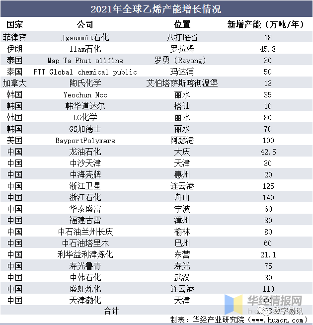 2021年全球前十大乙烯生廠商情況