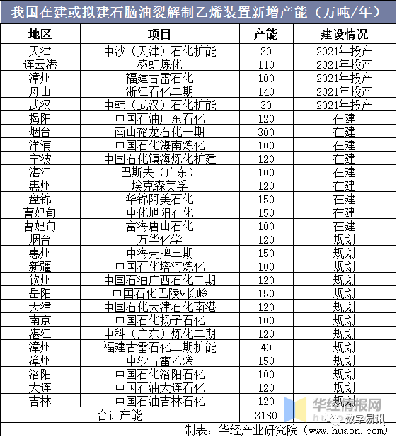 在乙烯盈利能力普遍穩(wěn)健、供需缺口較大的情況下,新建煉化一體化項目均配套大乙烯項目。隨著一批煉化項目配套乙烯裝置投產(chǎn),加之部分擴能改造項目,預(yù)計2021–2024年,我國將新增石腦油裂解乙烯產(chǎn)能約1670萬噸/年,另有規(guī)劃中的乙烯產(chǎn)能約1510萬噸/年,合計新增產(chǎn)能約3180萬噸/年。